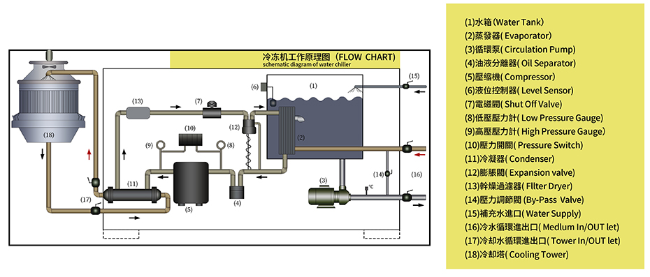 2.工作範圍:冷凍水溫度範圍-25℃至-5℃;冷凍水進出水溫差3℃至8℃。